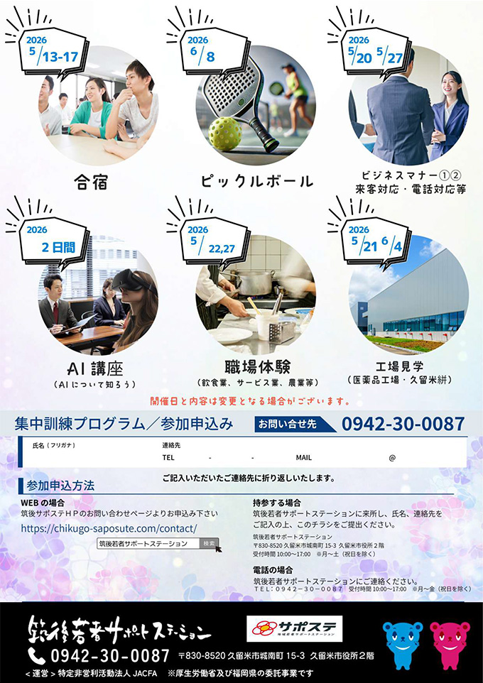 参加対象:「働く」 への一歩を踏み出したい 15歳から49歳までのお仕事をされていない方や就学中でない方